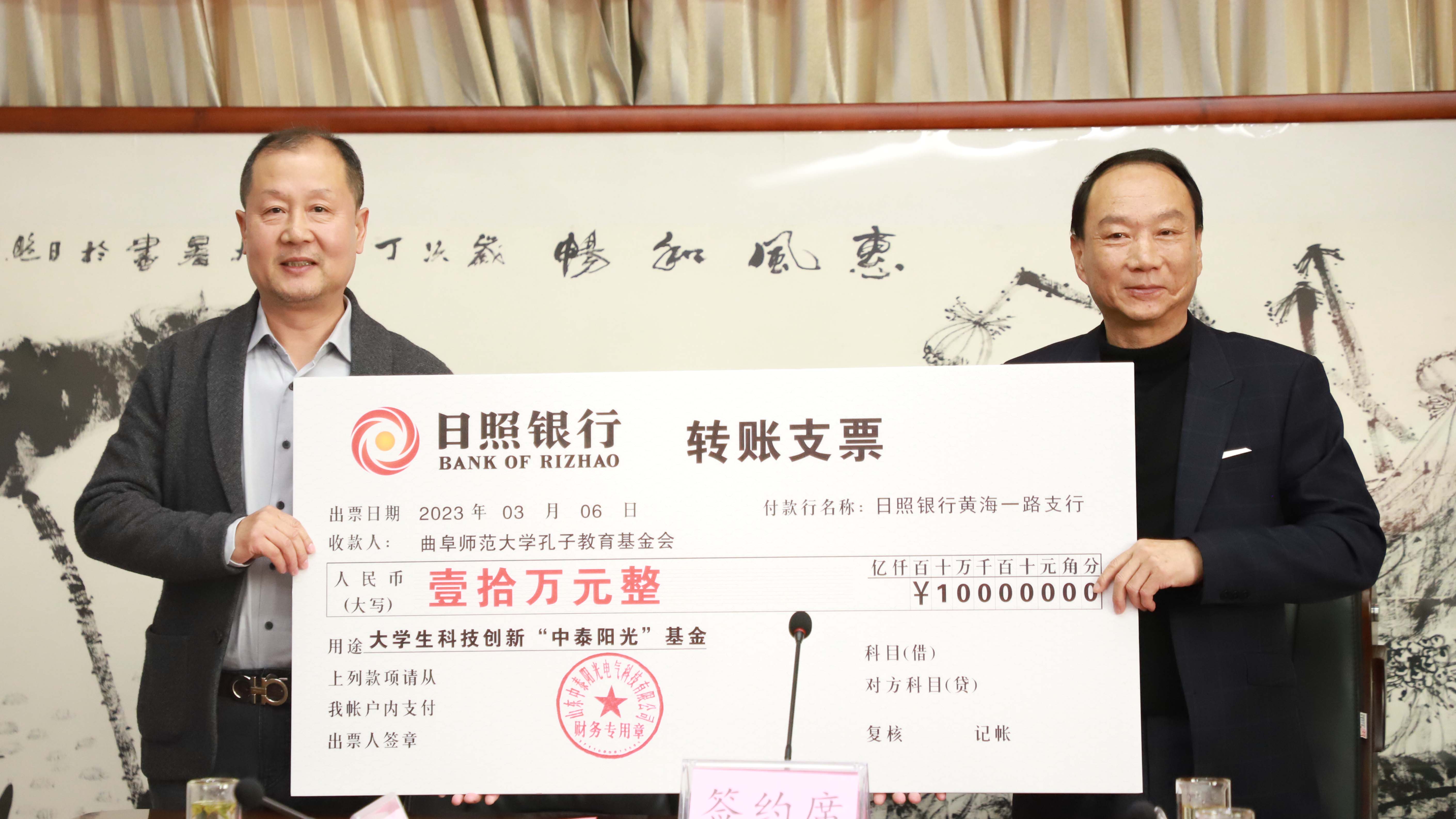 2023年3月6日上午,曲阜師范大學(xué)大學(xué)生科技創(chuàng)新“中泰陽光”基金捐贈儀式順利舉行。儀式由經(jīng)開區(qū)黨群工作部部長王法杰主持,曲阜師范大學(xué)黨委書記邢光、市政協(xié)副主席孟凡香、集團(tuán)董事長牟建出席并講話。參加此次會議的還有曲阜師范大學(xué)、市政協(xié)、經(jīng)開區(qū)及中泰陽光集團(tuán)有關(guān)負(fù)責(zé)同志。儀式上,公司順利將大學(xué)生科技創(chuàng)新“中泰陽光”基金捐贈予曲阜師范大學(xué)孔子基金會,并承諾為高校搭建企業(yè)科研創(chuàng)新基地和教學(xué)實踐基地。曲阜師范大學(xué)也表示,配合做好基金的監(jiān)管與發(fā)放,確保所有資金全部用于學(xué)生科技創(chuàng)新成果獎勵。儀式上,校企雙方達(dá)成共識,將以此次活動為契機(jī),繼續(xù)加強(qiáng)溝通、深化合作、優(yōu)勢互補(bǔ)、共同發(fā)展,努力構(gòu)建合作發(fā)展的新平臺。